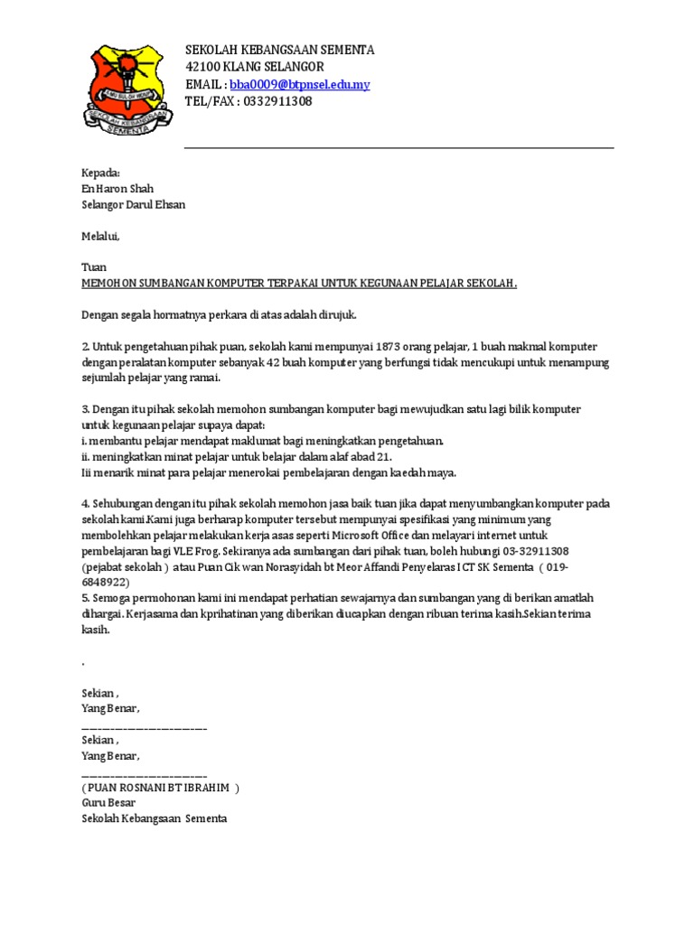 Contoh Surat Permohonan Bantuan Komputer. CONTOH SURAT PERMOHONAN PENGADAAN KOMPUTER. Contoh format surat kiriman rasmi.